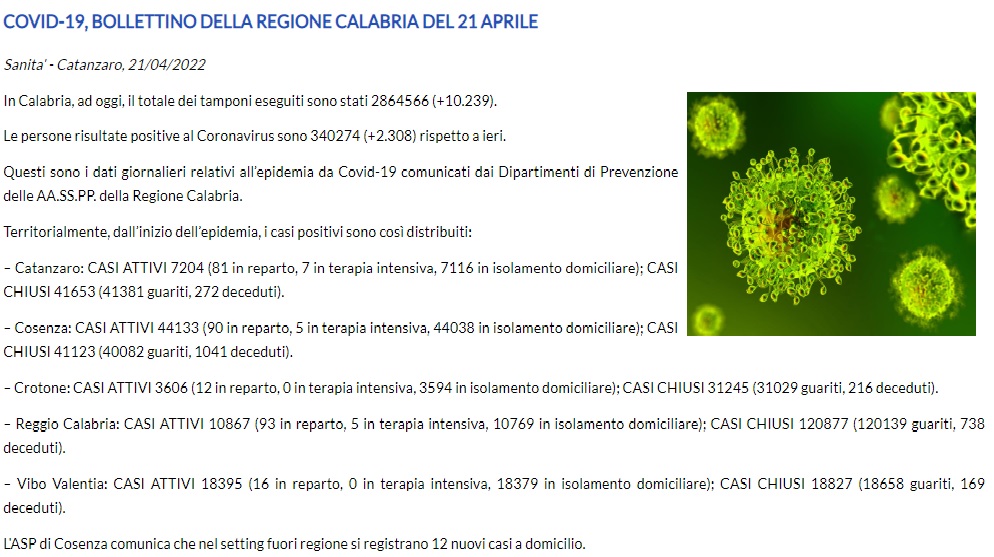 – Cosenza: CASI ATTIVI 44133 (90 in reparto, 5 in terapia intensiva, 44038 in isolamento domiciliare); CASI CHIUSI 41123 (40082 guariti, 1041 deceduti);