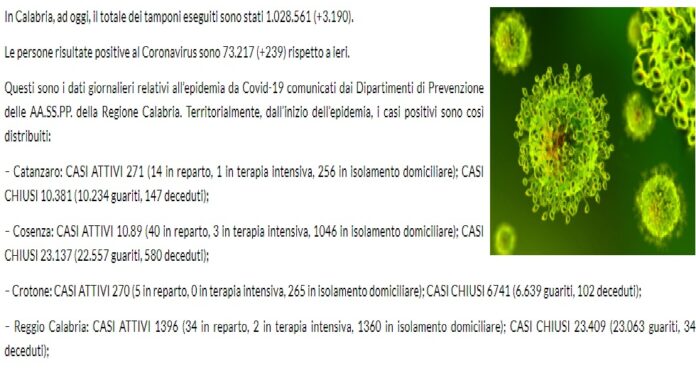 In Calabria, ad oggi, il totale dei tamponi eseguiti sono stati 1.028.561 (+3.190). Le persone risultate positive al Coronavirus sono 73.217 (+239) rispetto a ieri.