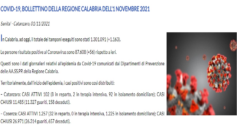 – Reggio Calabria: CASI ATTIVI 956 (45 in reparto, 3 in terapia intensiva, 908 in isolamento domiciliare); CASI CHIUSI 29.850 (29.441 guariti, 409 deceduti);
