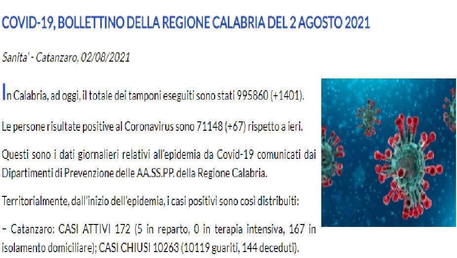 RISPETTO A IERI, OGGI 2 AGOSTO 2021 IN CALABRIA VI E' STATO UN INCREMENTO PARI A 67 UNITA'
