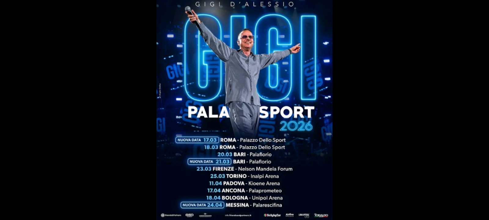 L’entusiasmo incontenibile per “GIGI PALASPORT 2026”, il nuovo tour di Gigi D’Alessio in partenza la prossima primavera, sta facendo registrare il boom di richieste: si aggiunge un’attesissima nuova tappa a Messina e raddoppiano le date di Roma e Bari. Il cantautore partenopeo tornerà ad incontrare il pubblico della Sicilia nel nuovo appuntamento live che arricchisce il calendario del tour con l’imperdibile tappa che si terrà il 24 aprile al Palarescifina di Messina.