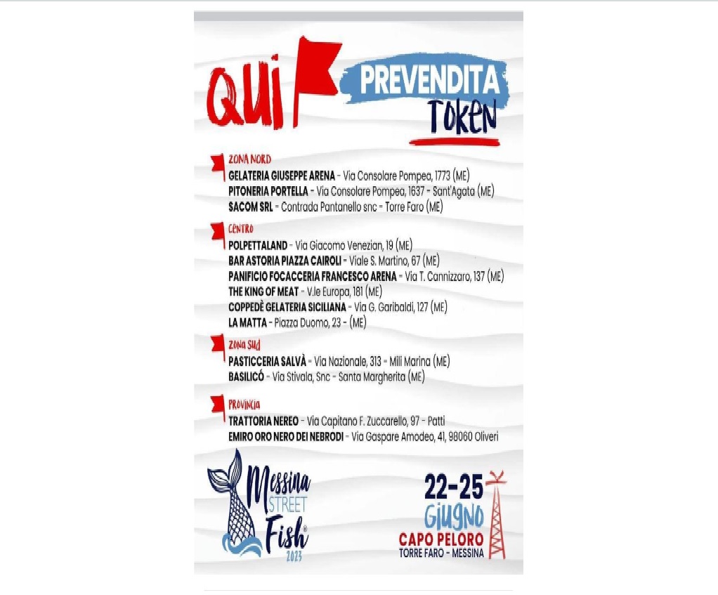 Prevendite – Intanto sul fronte organizzativo daL 16 GIUGNO 2023 sono aperte le prevendite in 13 punti vendita, 10 in centro e a Nord e Sud di Messina, due in provincia: zona Nord (Gelateria Giuseppe Arena, Pitoneria Portella, Sacom srl; in centro: Polpettaland, Bar Astoria, Panificio focacceria Francesco Arena, The king of meat, Coppedé gelateria siciliana, La Matta; zona Sud: Pasticceria Salvà, Basilicò e in provincia, presso la Trattoria Nereo a Patti e ad Oliveri da Emiro oro nero dei Nebrodi.