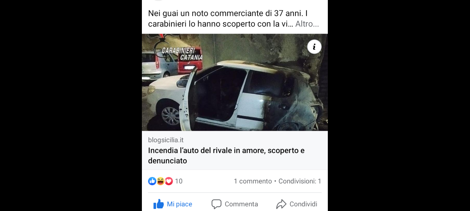 Il piromane, tuttavia, non ha fatto i conti con le numerose telecamere di sorveglianza presenti nella zona. I carabinieri hanno subito esaminato i filmati e da qui è stato possibile ricostruire gli eventi. Gli occhi elettronici hanno permesso di riconoscere l’autore del plateale gesto, una persona abbastanza noto in paese per la gestione di attività commerciali. Il giovane denunciato a piede libero alla Procura di Catania e adesso, oltre all’allontanamento della compagna, dovrà affrontare anche un processo penale.