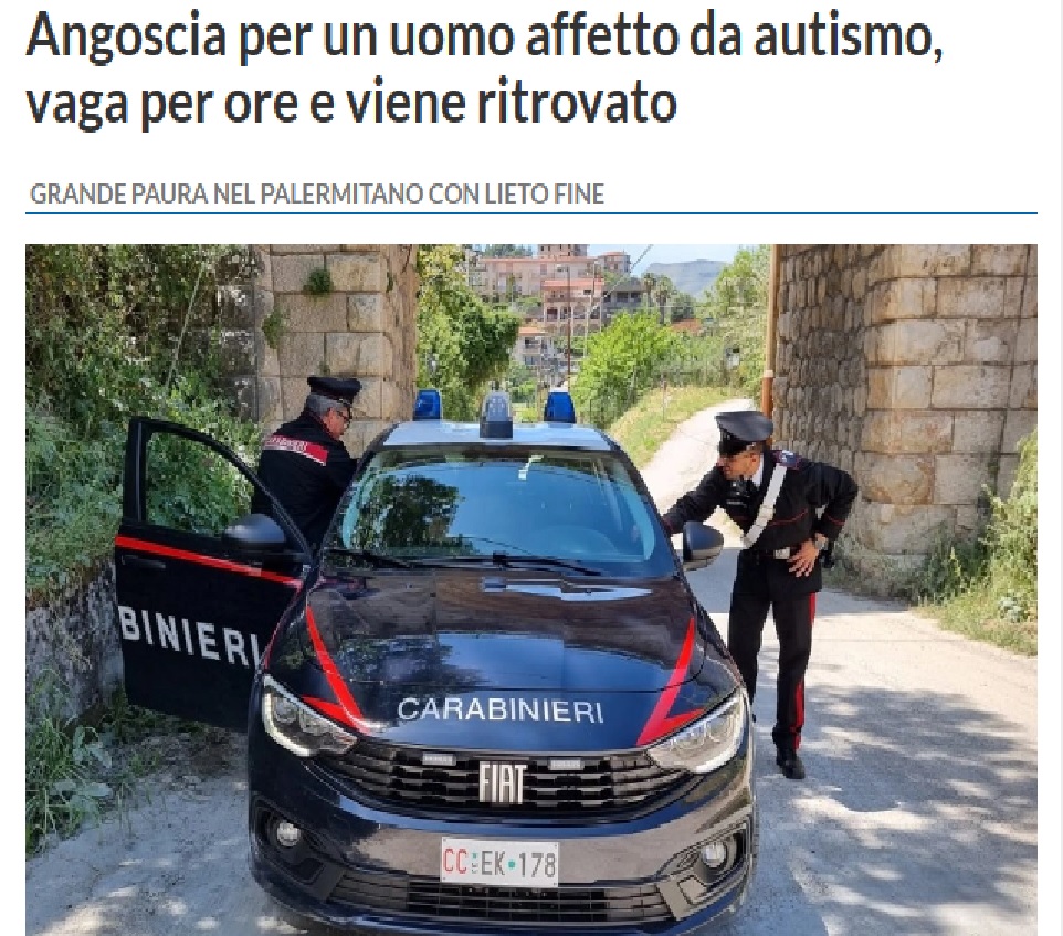 Lieto fine nel Palermitano ma sono state ore di angoscia per un uomo di 50 anni affetto da autismo ritrovato dai carabinieri in stato confusionale: era uscito per una passeggiata ma poi si è perso non riuscendo più a ritrovare la strada di casa. I carabinieri, dopo l’allarme lanciato dai familiari del disperso, sono riusciti a ritrovarlo… si tratta di un uomo affetto da autismo, sono state ore di grande angoscia.