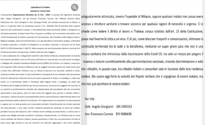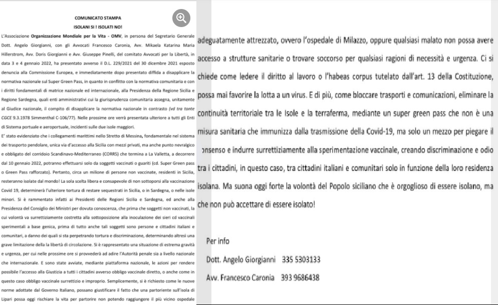 L’Associazione Organizzazione Mondiale per la Vita – OMV, in persona del Segretario Generale Dott. Angelo Giorgianni, con gli Avvocati Francesco Caronia, Avv. Mikaela Katarina Maria Hillerstrom, Avv. Doris Giorgianni e Avv. Giuseppe Pinelli, del comitato Avvocati per la Libertà, in data 3 e 4 gennaio 2022, ha presentato avverso il D.L. 229/2021 del 30 dicembre 2021 esposto denuncia alla Commissione Europea, e immediatamente dopo presentato diffida a disapplicare la normativa nazionale sul Super Green Pass, in quanto in conflitto con la normativa comunitaria e con i diritti fondamentali di matrice nazionale ed internazionale, alla Presidenza della Regione Sicilia e Regione Sardegna, quali enti amministrativi cui la giurisprudenza comunitaria assegna, unitamente al Giudice nazionale, il compito di disapplicare la normativa nazionale in contrasto…!