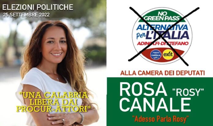 “A tutti i miei amati calabresi: “Una Calabria libera dai Procur-Attori è possibile”! Lo ha scritto oggi 26 agosto 2022, sulla sua Pagina Facebook ‘Adesso parla Rosy’ la cronista Rosa – Rosy Canale, candidata alla Camera dei deputati alle Elezioni del 25 settembre con ‘Alternativa per l’Italia’, il Partito costituito diversi mesi fa da Mario Adinolfi (Il Popolo della Famiglia) e Simone Di Stefano (Exit).
