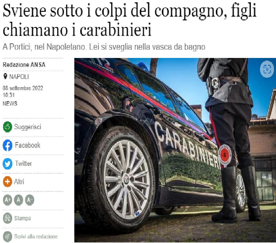 L’ultimo colpo sferrato dal compagno violento l’ha fatta svenire e lui, per rianimarla, l’ha sistemata nella vasca da bagno e le ha spruzzato dell’acqua in faccia: è quanto accaduto in un’abitazione di Portici, in provincia di Napoli, abitata da una famigliola di ucraini giunti in Italia nel 2016
