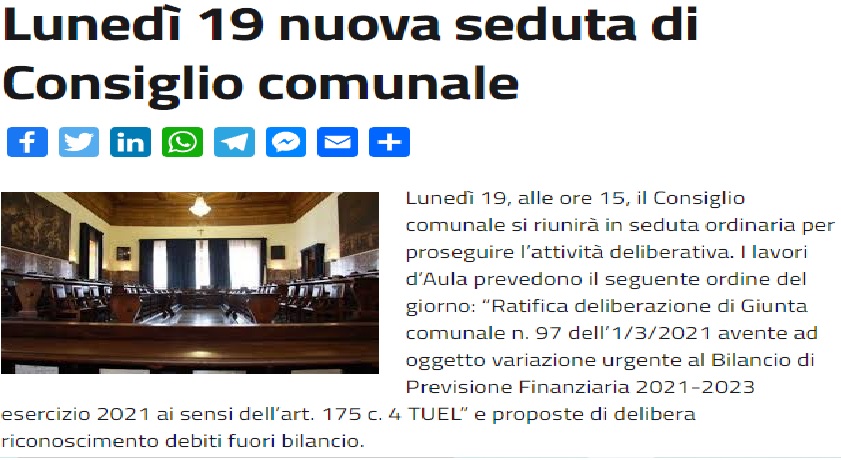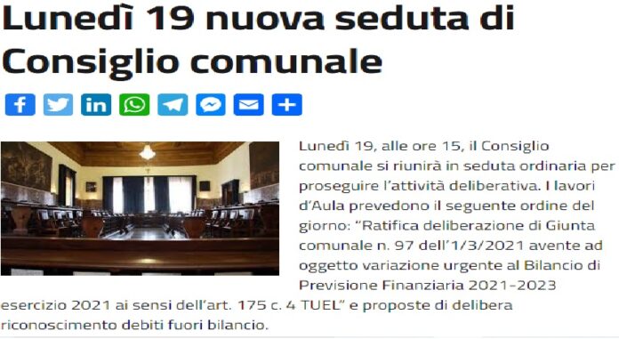 I lavori d’Aula prevedono il seguente ordine del giorno: “Ratifica deliberazione di Giunta comunale n. 97 dell’1/3/2021 avente ad oggetto variazione urgente al Bilancio di Previsione Finanziaria 2021-2023 esercizio 2021 ai sensi dell’art. 175 c. 4 TUEL” e proposte di delibera riconoscimento debiti fuori bilancio.