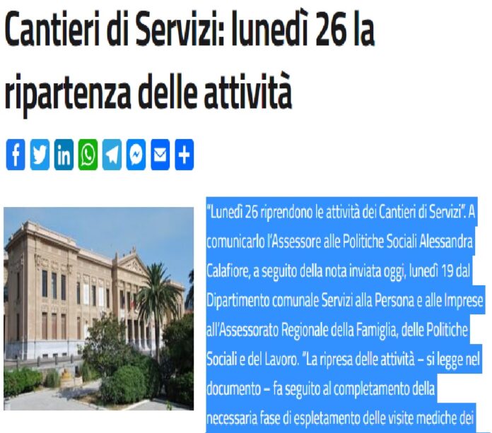 “Lunedì 26 riprendono le attività dei Cantieri di Servizi”. A comunicarlo l’Assessore alle Politiche Sociali Alessandra Calafiore, a seguito della nota inviata oggi, lunedì 19 dal Dipartimento comunale Servizi alla Persona e alle Imprese all’Assessorato Regionale della Famiglia, delle Politiche Sociali e del Lavoro.