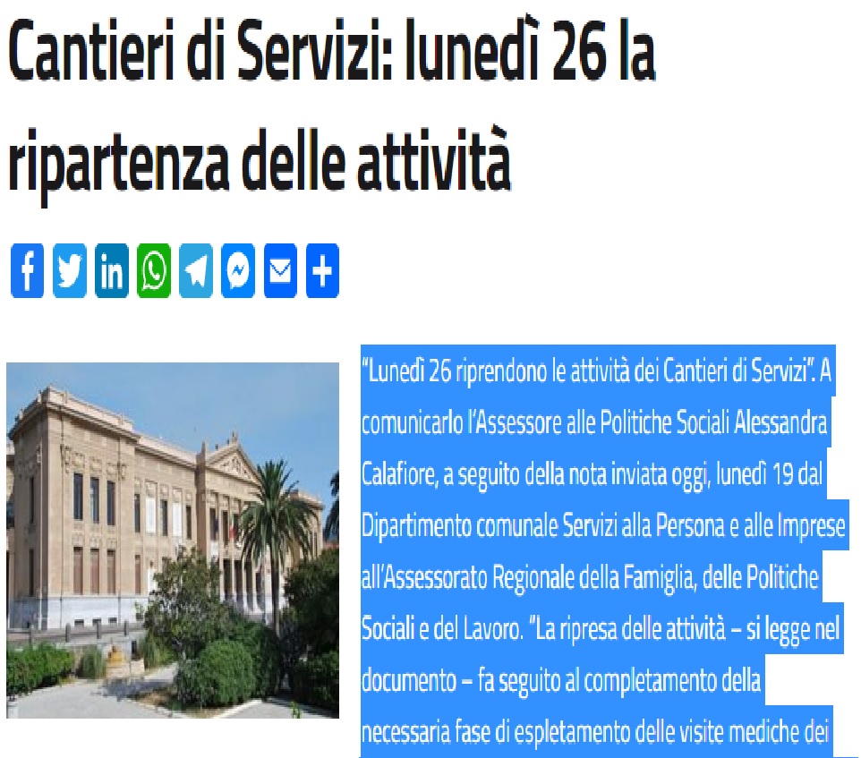 “La ripresa delle attività – si legge nel documento – fa seguito al completamento della necessaria fase di espletamento delle visite mediche dei beneficiari delle attività dei Cantieri di Servizi e di quella relativa alla revisione della documentazione in merito alla sicurezza sui luoghi di lavoro”.