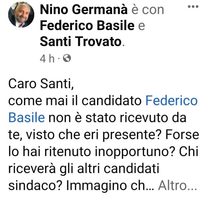 “Ma poi…, caro Nino mi chiedi di dimettermi proprio tu che ti eri proposto candidato sindaco contro Basile e ora sei diventato suo sostenitore?”. Per rispondere al deputato leghista, messinese, a Montecitorio, Germanà, se Lo è chiesto…, ieri 10 maggio 2022, in un post sulla sua Pagina Facebook Santi Trovato presidente dell’Ordine degli Ingegneri di Messina e assessore designato dal candidato a sindaco del centrodestra MaurizIo Croce, per le Elezioni Amministrative del 12 giugno.