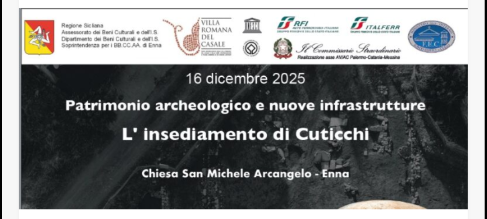 Martedì 16 dicembre alle ore 9:30 nella Chiesa di San Michele Arcangelo di Enna, alla presentazione della mostra “Patrimonio archeologico e nuove infrastrutture: l’insediamento di Cuticchi.