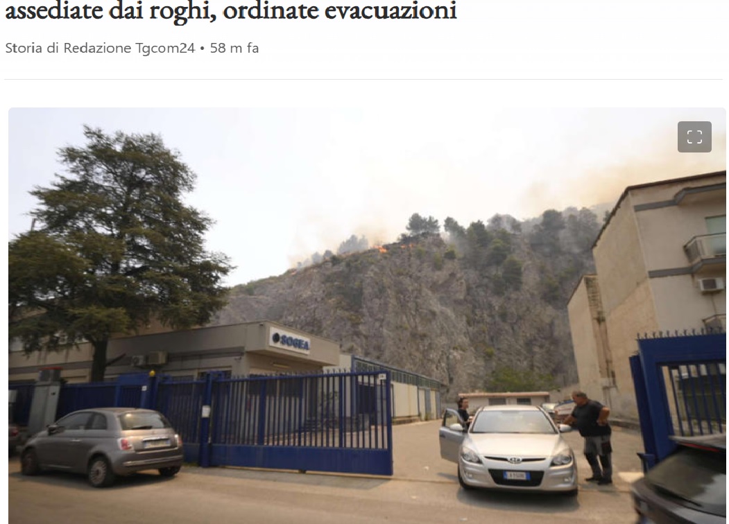 Nella zona di San Martino delle Scale, nel Palermitano, una donna di 88 anni, Rita Gaetana Pillitteri, in precarie condizioni di salute è morta perché i sanitari del 118, a causa degli incendi, non sono riusciti ad arrivare a prestarle soccorso. L’Asp di Palermo, con un avviso alla popolazione, raccomanda di evitare l’esposizione prolungata all’aperto “se non in casi strettamente necessari”. Situazione di emergenza nella contrada Feo Coniglio, ubicata a ridosso della frazione di Trappitello, a Taormina, dove si trovano ville di pregio minacciate da un vasto rogo. Sul posto il sindaco, Cateno De Luca, che ha fatto evacuare numerose abitazioni.