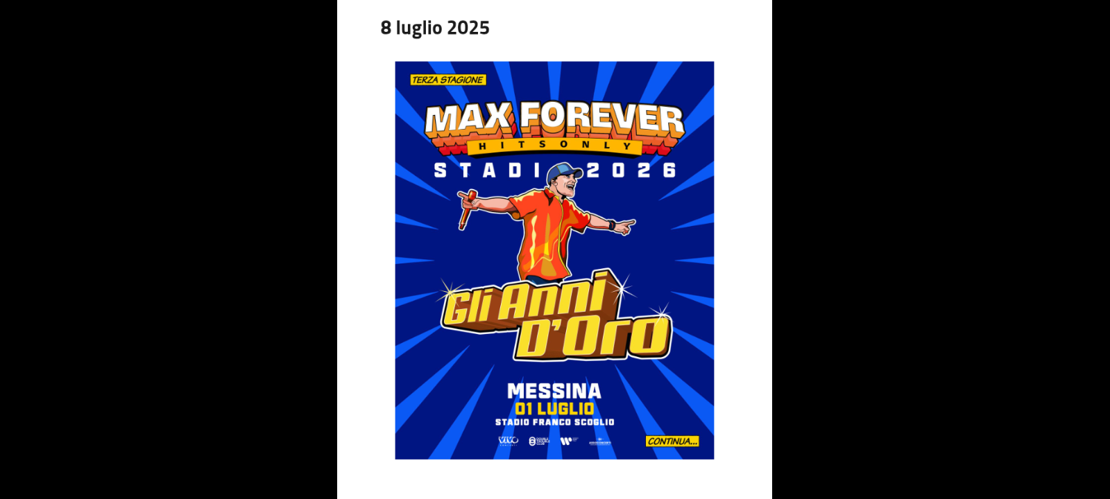 “Accogliere ancora una volta Max Pezzali nella nostra città è motivo di grande orgoglio e conferma la centralità di Messina nei principali circuiti nazionali della musica dal vivo. Il “Franco Scoglio” si prepara a ospitare un altro grande appuntamento capace di coinvolgere migliaia di spettatori da tutta la Sicilia e non solo. Eventi di questa portata rappresentano non solo un’opportunità di promozione culturale e turistica, ma anche un’occasione concreta per favorire l’aggregazione e l’inclusione sociale, contribuendo a costruire una città sempre più viva, partecipata e accogliente”, dichiarano il Sindaco Federico Basile el’Assessore ai Grandi Eventi Massimo Finocchiaro.