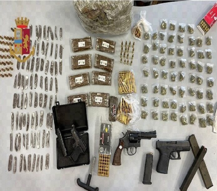 Ancora, gli agenti hanno rinvenuto altre 213 cartucce di vario calibro, un ordigno artigianale, costituito da un barattolo di vetro chiuso con tappo sigillato da nastro adesivo e completo di miccia allacciata ad un dispositivo di accensione elettronico, 60 bustine contenenti circa 100 grammi di marijuana, una busta con circa 550 grammi della stessa sostanza, 79 stecche di hashish del peso di circa 165 grammi e 9 panetti della stessa sostanza del peso di circa 900 grammi.