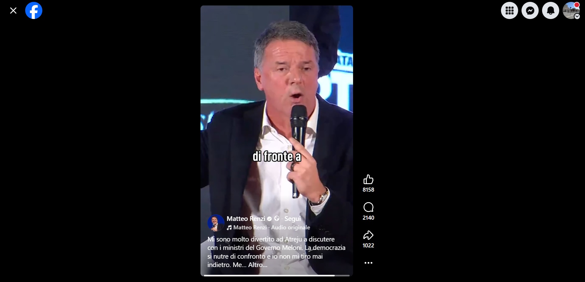 “Mi sono molto divertito ad Atreju a discutere con i ministri del Governo Meloni: La democrazia si nutre di confronto e io non mi tiro mai indietro… meno divertente il fatto che loro pensino che in Italia vada tutto bene… e che quando uno critica deve essere fermato con FakeNews come quelle della Casellati”. A scriverlo ieri, sulla sua omonima Pagina Facebook, è stato il senatore di Palazzo Madama a Roma e leader di ‘Italia Viva’, Matteo Renzi.