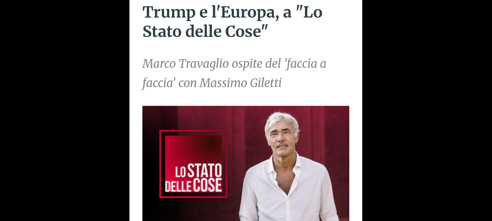 ‘Michele Santoro interverrà sulla sfida di Trump all’Europa e sulle guerre in Ucraina e Medio Oriente; il “faccia a faccia” vedrà protagonista il direttore de “Il Fatto Quotidiano” Marco Travaglio: al centro del confronto gli scenari internazionali, il governo di Giorgia Meloni e la politica delle opposizioni; si tornerà sul caso del delitto di Garlasco che dopo 18 anni è stato riaperto. La nuova indagine vede come unico indagato per l’omicidio, in concorso con altre persone, Andrea Sempio, amico del fratello di Chiara Poggi. Ma chi è Andrea Sempio? E perché torna, per la seconda volta, al centro delle indagini? Molti gli interrogativi che attendono risposte. Anche il caso mediatico dei messaggi di una delle cugine di Chiara, Paola Cappa, sarà al centro del dibattito al quale prenderanno parte l’avvocato di Stasi, De Rensis, il direttore di “Gente” Umberto Brindani e Ilenia Petracalvina, inviata che per anni ha seguito le indagini. In esclusiva, parla anche un amico di Paola che negli ultimi mesi ha ricevuto centinaia di messaggi audio dalla ragazza proprio sul caso dell’omicidio di sua cugina Chiara’. Questi…, sono alcuni dei temi della penultima puntata di questa stagione per “Lo Stato delle Cose”, il programma condotto da Massimo Giletti in onda lunedì 26 maggio alle 21.20 su Rai3.