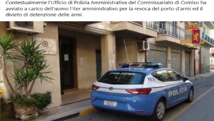 Grazie alla descrizione dell’uomo fornita dalla denunciante, gli Agenti del Commissariato di Comiso si sono messi alla ricerca dell’anziano, individuandolo in poco tempo e procedendo nei suoi confronti con il deferimento all’Autorità Giudiziaria per i reati di lesioni e violenza privata. Contestualmente, gli Agenti hanno proceduto ad ulteriori controlli, all’esito dei quali l’uomo è risultato detentore presso la propria abitazione, regolarmente, di una pistola ed un fucile da caccia. In considerazione della condotta violenta di cui l’anziano si era reso responsabile, le armi sono state ritirate in via cautelare, in forza di quanto previsto dal Testo Unico delle leggi di Pubblica Sicurezza.