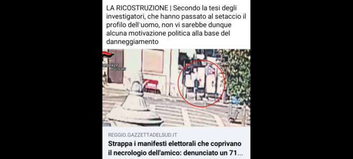 Secondo la tesi degli investigatori, che hanno passato al setaccio il profilo dell’uomo, non vi sarebbe alcuna motivazione politica alla base del danneggiamento, la cui causa scatenante è stato il fatto che i manifesti, come previsto dalle disposizioni comunali, erano stati affissi nella bacheca consuetudinariamente usata per i necrologi locali, andando a coprire quello di un intimo amico dell’anziano signore. Il trasgressore…, è stato deferito alla Procura della Repubblica di Palmi per il reato di ‘distruzione di manifesti elettorali legittimamente affissi’, che l’amministrazione comunale si è fatta carico di ripristinare.