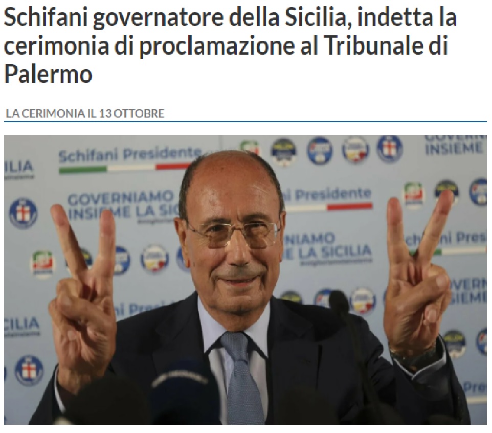 Domani pomeriggio, 13 ottobre, il candidato del centrodestra che ha vinto le elezioni regionali, Renato Schifani sarà ufficialmente proclamato presidente della Regione Siciliana.