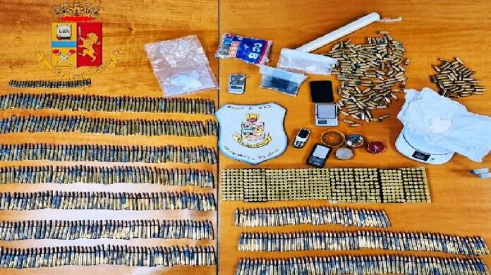 Dopo le formalità di rito, l’arrestato è stato posto agli arresti domiciliari. Nel corso dei servizi di controllo effettuati con i cinofili, l’attenzione dei poliziotti è stata attirata da un’abitazione abbandonata e con il portone spalancato, all’interno della quale gli agenti hanno rinvenuto due sacche da spalla all’interno delle quali c’era munizionamento di vario calibro, anche da guerra, per un totale complessivo di 1487 munizioni. Il materiale rinvenuto è stato posto sotto sequestro a carico di ignoti.