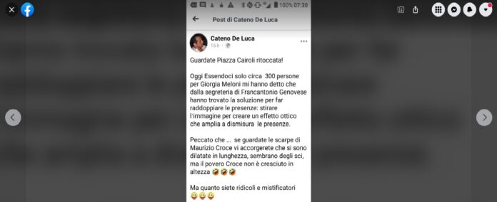 Nel pomeriggio di ieri, l’ex sindaco di Messina Cateno De Luca ha pubblicato sulle sue due omonime Pagine Facebook un Post scrivendo falsità su una fotografia realizzata durante la manifestazione di Fratelli d’Italia tenutasi in piazza Cairoli dopo le 12.15… ed alla quale ha partecipato la leader del Partito Giorgia Meloni… in cui è stato immortalato Maurizio Croce il candidato del centrodestra alle Elezioni del 12 giugno 2022.