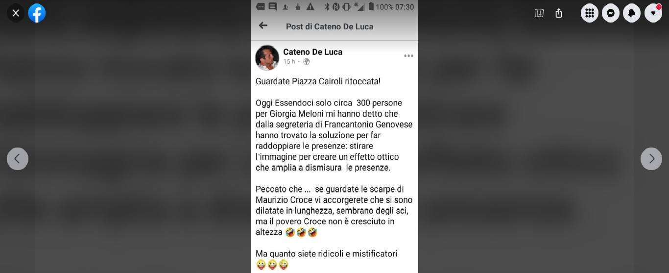 De Luca ha affermato ridicolizzando e diffamando gli avversari, tale bugia: “guardate piazza Cairoli ritoccata! Hanno trovato la soluzione per far raddoppiare le presenze… stirare l’immagine per creare un effetto ottico che amplia a dismisura le presenze”. Ma quanto siete ridicoli e mistificatori”.