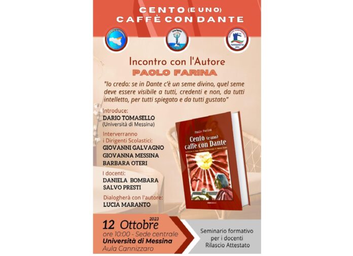 Dialogheranno con l’autore Barbara Oteri, dirigente scolastico e Salvo Presti curatore della rubrica culturale “Sicilia Mater”. La presentazione sarà arricchita da un seminario formativo dedicato alla figura di Dante curato dalle docenti Daniela Bombara, Anna Fareri e dal Dirigente scolastico del CPIA di Messina Giovanni Galvagno. La presentazione di “Cento (e uno) caffè con Dante” si replicherà il 12 ottobre alle ore 10,00 all’Aula Cannizzaro nella sede centrale dell’Università di Messina con l’introduzione di Dario Tomasello docente dell’ Università di Messina, l’intervento dei dirigenti scolastici Giovanni Galvagno (Cpia – Messina), Giovanna Messina (Liceo F. Bisazza), Barbara Oteri (Istituto Comprensivo Torregrotta) e dei docenti Daniela Bombara e Salvo Presti. Dialogherà con l’autore Lucia Maranto. Gli eventi sono curati dalle docenti Cristina Cucinotta e Rosaria Rizzo. Un “caffè” alla settimana per quasi due anni.