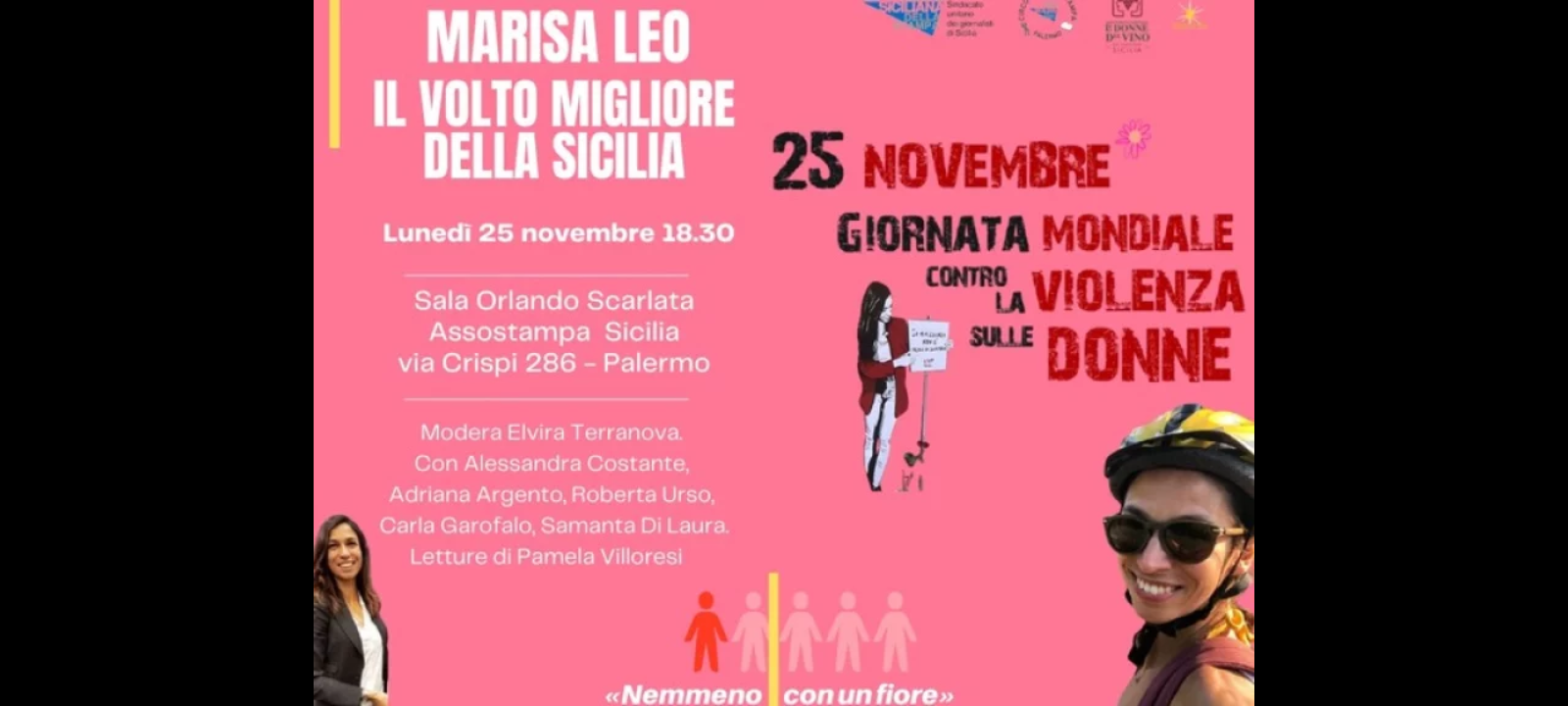 A moderare l’incontro sarò la giornalista Elvira Terranova, mentre le letture sono affidate a Pamela Villoresi, che saluta Palermo dopo Elvira Terranova l’esperienza alla direzione del teatro Biondo. Al Circolo partecipano Alessandra Costante, segretaria generale FNSI, Carla Garofalo, avvocata, Roberta Urso, Associazione donne del vino e Samantha Di Laura dell’Associazione Marisa Leo. Al termine dell’incontro verrà consegnata una targa ai genitori della giovane vittima.