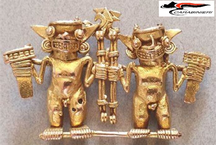 Nella mattina di ieri presso il Museo delle Civiltà di Roma, il Comandante del Nucleo Carabinieri Tutela Patrimonio Culturale di Venezia ha consegnato al direttore del Museo 2 importantissimi reperti archeologici mesoamericani. Presentato il pendente in oro a doppia figura della cultura del Gran Coclé di Panama (650-1520 d.C.) che raffigura due guerrieri in atto di ostentare, ciascuno, un’insegna da guerra e un lancia-dardi. Il reperto è verosimilmente parte di un corredo funebre di un personaggio di alto rango, quale un capo, un sacerdote o uno sciamano. A fronte della raffinata fattura, della rarità nelle raccolte italiane e della rilevante testimonianza dell’arte precolombiana dell’America Centrale, su proposta del Nucleo CC TPC di Venezia e istruttoria della Soprintendenza ABAP di Venezia, il Segretariato Regionale del Veneto ne ha dichiarato l’interesse particolarmente importante previsto dal Codice dei Beni Culturali e del Paesaggio.