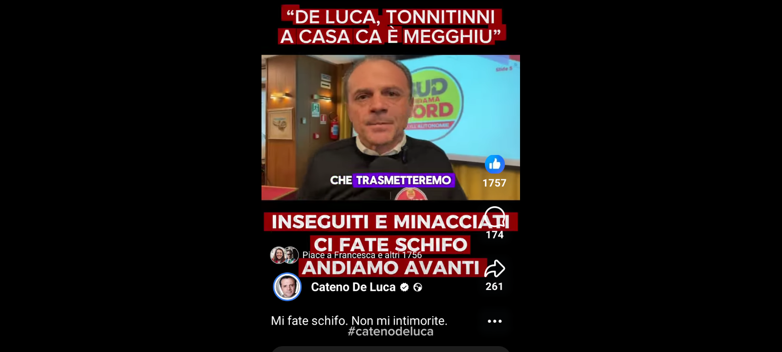 De Luca sulle sue omonime Pagine Facebook ha scritto: “Mi fate schifo. Non mi intimorite. Inseguiti e minacciati. Andiamo avanti”.