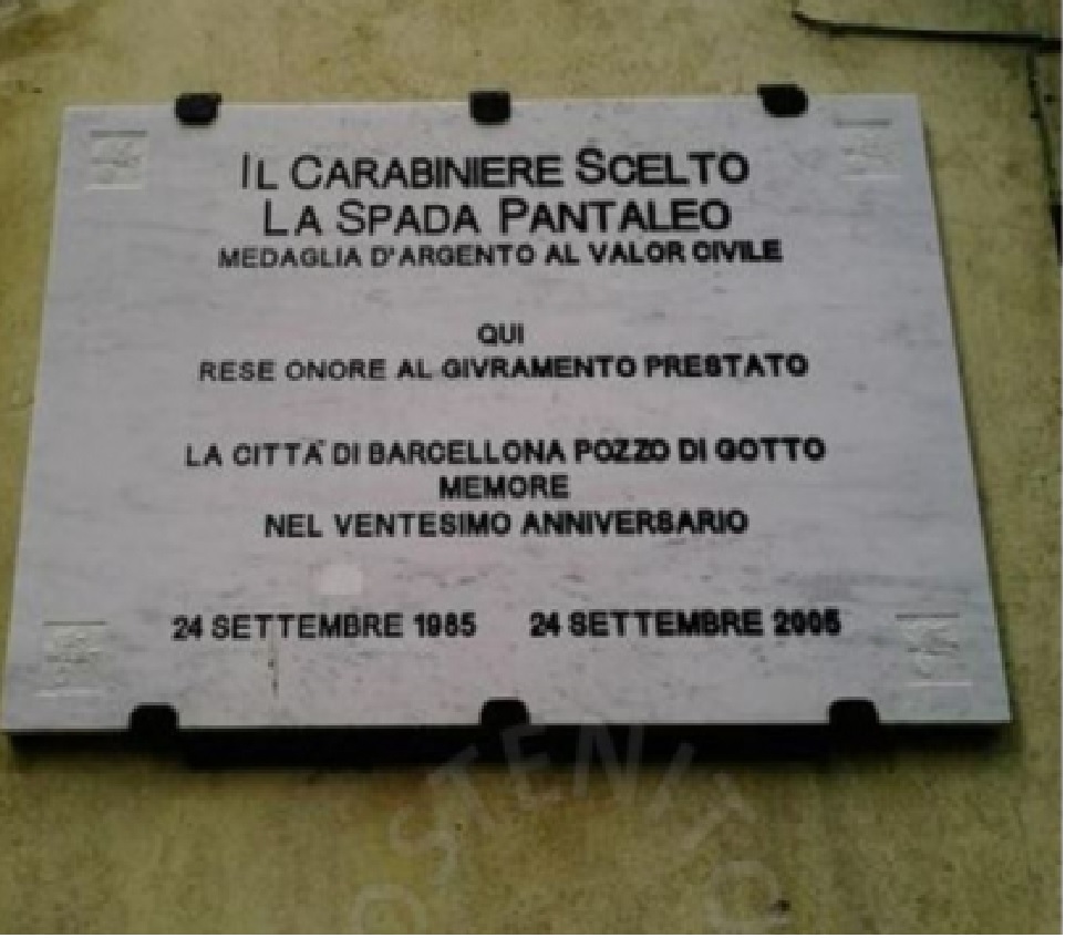 Era il 24 settembre 1985, quando il Carabiniere Pantaleo Mario LA SPADA “in servizio di pattuglia automontata con pari grado, avuta notizia che in una gioielleria sita nel centro abitato della città era in corso una rapina, accorreva prontamente sul posto e, dando prova di ferma determinazione e sereno sprezzo del pericolo, si disponeva ad affrontare armi in pugno i malviventi, venendo però ferito a morte da due colpi di fucile proditoriamente esplosi da complice rimasto defilato all’esterno”.
