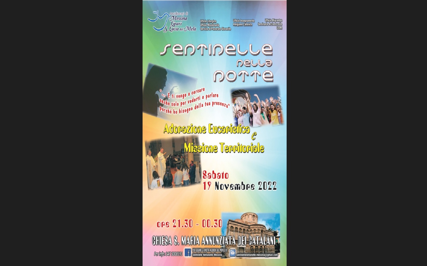 Nell’ambito del progetto pastorale “Sentinelle nella notte”, sabato 19 novembre, dalle ore 21.30 alle ore 00.30, presso la chiesa “SS. Annunziata dei Catalani”, alcuni Uffici e organismi diocesani (Ufficio Liturgico, Ufficio Migrantes, Ufficio Missionario, Ufficio Insegnamento Religione Cattolica, Pastorale Giovanile Diocesana, Seminario Arcivescovile, Usmi) proporranno un’esperienza di Adorazione Eucaristica e missione territoriale rivolta soprattutto ai giovani della nostra città. Presiederà l’Adorazione comunitaria delle ore 21.30 il Vescovo Ausiliare Sua Ecc.za Mons. Cesare Di Pietro.