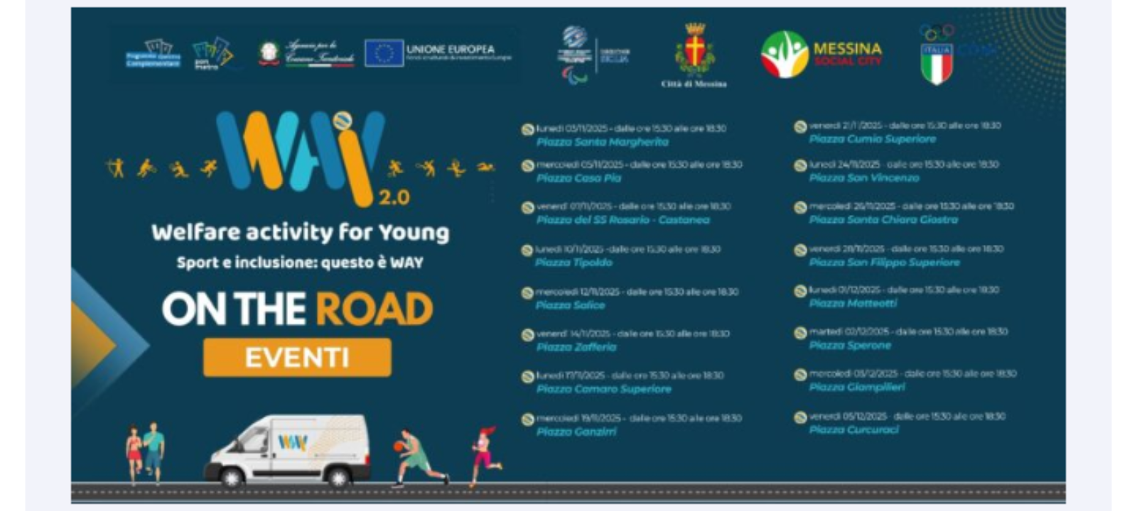 Nell’ambito del progetto WAY – Welfare Activity for Young 2.0, prende avvio ‘WAY on the ROAD’, l’azione itinerante promossa da Messina Social City in collaborazione con il Comune di Messina. Un’iniziativa che rinnova e rafforza l’impegno verso i territori, portando attività educative, ludiche e sportive direttamente nei quartieri della città, per costruire relazioni, promuovere partecipazione e favorire inclusione sociale.