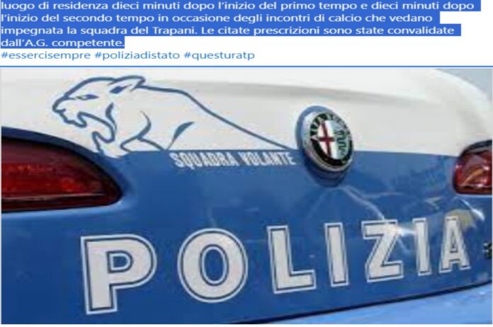 Nell’ambito delle attività di prevenzione al fenomeno della violenza durante le manifestazioni sportive il Questore di Trapani ha emesso due provvedimenti di Divieto di Accesso alle manifestazioni Sportive (DASPO) nei confronti di altrettanti tifosi della squadra di calcio “F.C. Trapani 1905”.