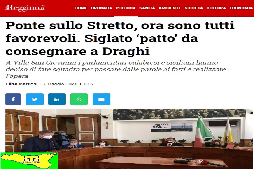 «Proprio da qui, dalla riva dello stretto, deve partire quel “patto del ponte”, senza distinzione di colore e dai rappresentanti delle regioni e dei comuni, che sottoporremo al ministro per il sud Mara Carfagna, al ministro delle infrastrutture e al presidente del consiglio Mario Draghi, persona seria e concreta, che rappresenta tutti al governo e che ha la nostra piena fiducia, affinché valuti l’inserimento della realizzazione del ponte dello stretto nei fondi pnrr considerando come detto prima che il progetto del ponte esiste ed è stato approvato ed è cantierabile da subito». Per Siclari «è necessario arrivare allo sviluppo del potenziale finora inespresso dei nostri luoghi del nostro paese e che si può esprimere solo portando il sud in Europa grazie alla realizzazione dell’alta velocità e dell’alta capacita’ ferroviaria fino a Palermo attraverso il ponte dello stretto ed attraversando tutto il sud. Questo puo’ fare sviluppare i porti, il settore agroalimentare, il settore turistico, enogastronomico ed industriale del sud italia.