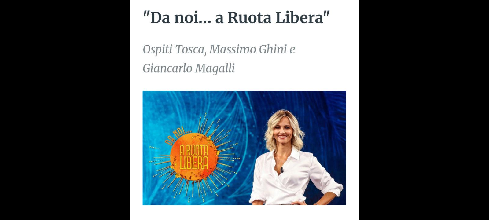 “Da noi… a Ruota Libera” è una trasmissione condotta da Francesca Fialdini, nella quale la conduttrice spiega la vita artistica e privata di personaggi celebri e non che hanno saputo imprimere un “giro di Ruota” originale e positivo alla propria vita e a quella degli altri compiendo scelte coraggiose e anticonvenzionali. Un percorso di emozioni, ricordi, riflessioni, momenti d’ironia e leggerezza.