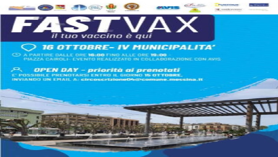 Nuovo appuntamento con l’iniziativa “FastVax – il tuo vaccino è qui”: sabato 16 ottobre in piazza Cairoli a Messina sarà possibile ricevere la somministrazione con o senza prenotazione dalle ore 16 alle 19. L’evento, ideato dall’ufficio per l’emergenza covid guidato dal Prof. Alberto Firenze, è promosso insieme con la Quarta Municipalità e si svolgerà in collaborazione con la sezione Avis di Messina che informerà e sensibilizzerà anche sull’importanza della donazione del sangue.