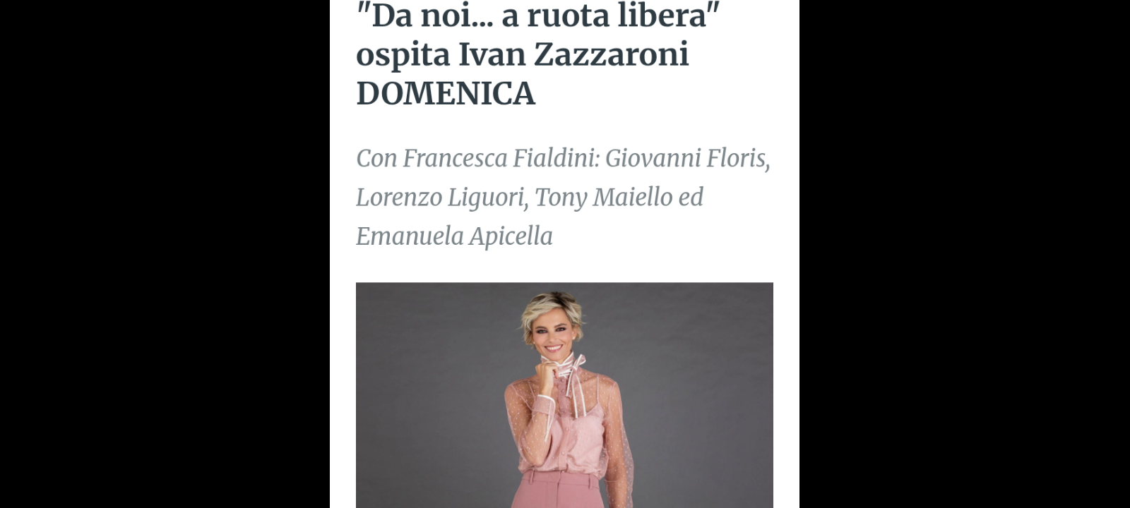Nuovo appuntamento, domenica 16 novembre su Rai1 alle 17.20, con “Da noi… a Ruota Libera”, il programma condotto da Francesca Fialdini. Come sempre, al centro del programma, le interviste di Francesca Fialdini ai protagonisti del mondo dello spettacolo e i racconti di storie vere, forti ed esemplari di persone comuni che hanno saputo dare una svolta alla loro vita, rimettendosi in gioco e riuscendo a far girare la Ruota, metafora di rinascita, cambiamento e coraggio.
