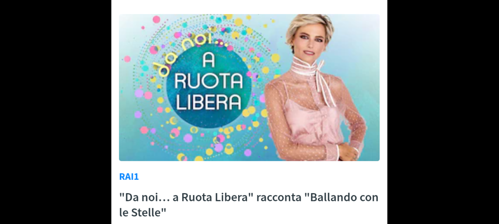Nuovo appuntamento, domenica 28 settembre alle 17.20 su Rai1, con “Da Noi… a Ruota Libera”, il programma di Francesca Fialdini, realizzato dai membri della Direzione Intrattenimento Day Time in collaborazione con Endemol Shine Italy.