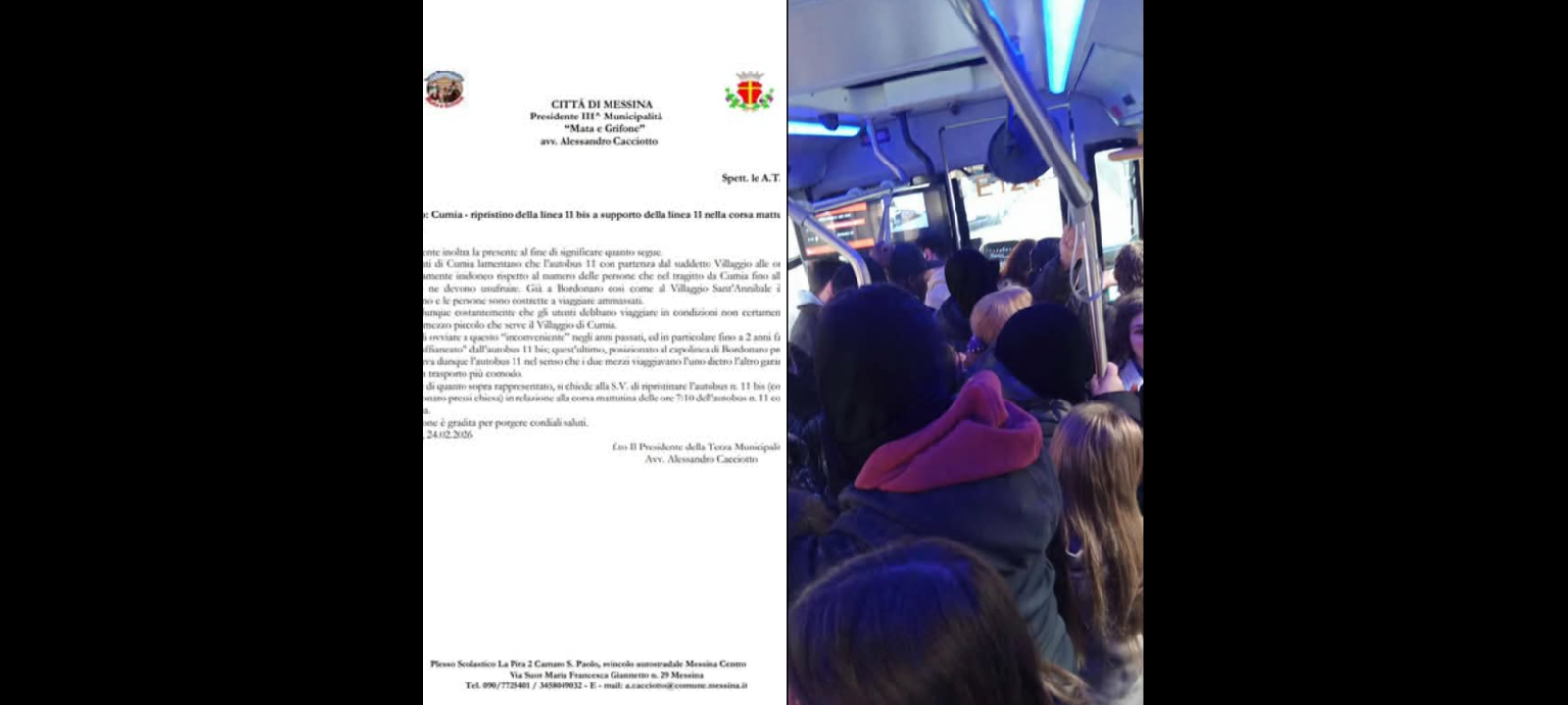 - “I residenti di Cumia lamentano che l’autobus 11 con partenza dal suddetto Villaggio alle ore 7:10, sia oggettivamente inidoneo rispetto al numero delle persone che nel tragitto da Cumia fino alla Stazione Centrale ne devono usufruire. Già a Bordonaro cosi come al Villaggio Sant’Annibale il mezzo è pienissimo e le persone sono costrette a viaggiare ammassati”;