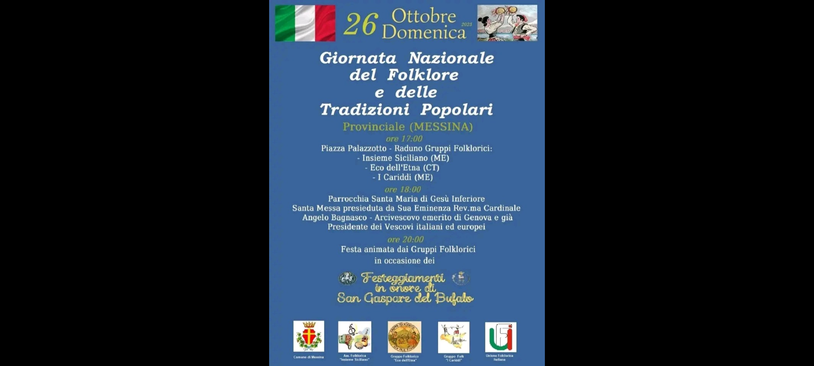 Oggi 26 Ottobre 2025, domenica: si terrà la Giornata Nazionale del Folklore e delle Tradizioni Popolari a Provinciale (Messina).
