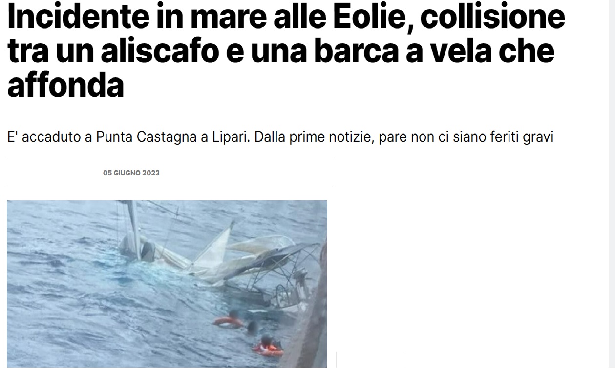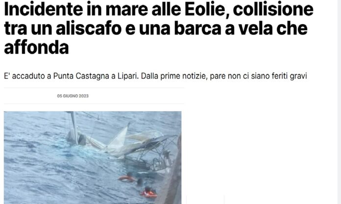 Oggi, alle 15:30, tra Salina e Lipari nei pressi di ‘Punta Castagna’ un aliscafo della Liberty Lines, Calypso, ha avuto una collisione con una barca a vela che subito dopo è affondata: a bordo del natante c’erano una bambina con i due genitori. Le origini alla base dell’urto sono al momento sconosciute, ma la dirigenza della compagnia di navigazione siciliana precisa che non ci sono vittime, né feriti.