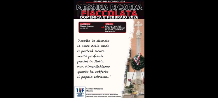 Oggi domenica 8 Febbraio dalle ore 18:30, in occasione della giornata del ricordo, si terrà a Messina una fiaccolata commemorativa in memoria dei Martiri delle Foibe e delle vittime dell’esodo Istriano, Fiumano e Dalmata.