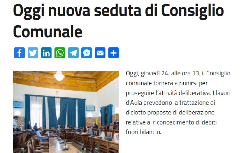 Oggi, giovedì 24, alle ore 13, il Consiglio comunale tornerà a riunirsi per proseguire l’attività deliberativa.