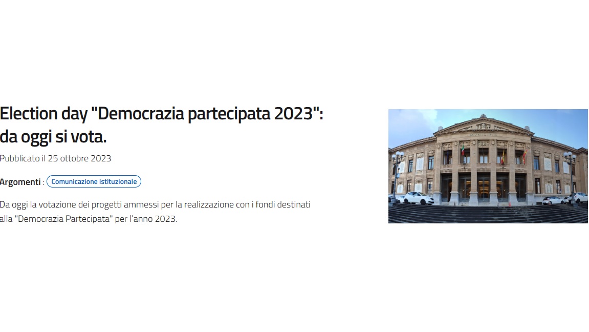 Oggi, mercoledì 25 ottobre, sino alle ore 12.30, presso la sede della II Municipalità di Messina, sita al 2° piano del palazzo dei Servizi dello stadio San Filippo sul viale degli Agrumi, si svolge l’Election Day per la votazione della cittadinanza dei progetti ammessi per la realizzazione con i fondi destinati alla “Democrazia Partecipata” per l’anno 2023. Il calendario degli altri appuntamenti dell’Election Day prevede domani, giovedì 26, dalle ore 9 alle 13, nella VI Municipalità in via Consolare Pompea, 1853; venerdì 27, dalle 8.30 alle 13, a palazzo Zanca, nei locali dell’assessorato dei Servizi al Cittadino; lunedì 30 ottobre, dalle 9 alle 13, nella sede della III Municipalità “Mata e Grifone” e della I Circoscrizione “Kalonerò” in vico Petraro 3; martedì 31 ottobre, dalle 9 alle 13, nella sede della V Circoscrizione in via Petrina, 2 a Villa Lina, e dalle 8.30 alle 12, nella IV Municipalità in via dei Mille, is. 88.