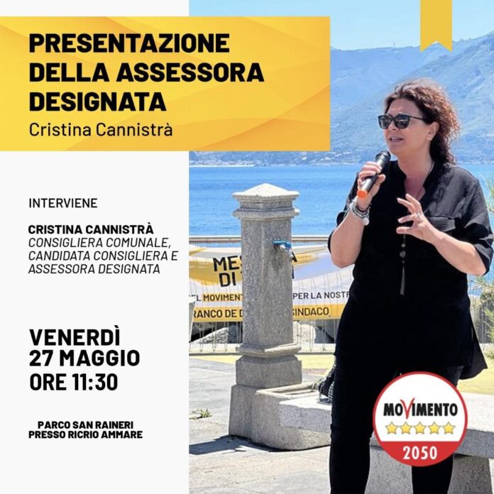 “Oggi, venerdì 27 maggio alle ore 11:30, si terrà la presentazione della assessora designata Cristina Cannistrà”. Di questo hanno dato notizia nelle scorse ore su Facebook i responsabili del MoVimento 5 Stelle di Messina in relazione alla designazione della consigliera comunale uscente nella eventuale futura Giunta di Franco De Domenico, il candidato sindaco di centrosinistra alle Elezioni del 12 giugno 2022.
