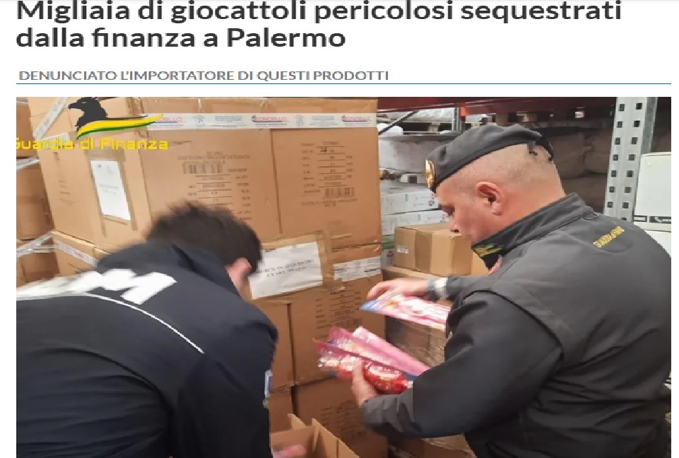 Oltre 2 mila giocattoli cinesi sono stati sequestrati al porto di Palermo dai militari della Guardia di finanza e dai funzionari delle dogane. Da analisi cliniche è emerso che i prodotti per i bambini era potenzialmente pericolosi per la salute a causa dell’elevata presenza di “ftalati”, sostanza utilizzata per rendere i prodotti plastici maggiormente pieghevoli e morbidi.