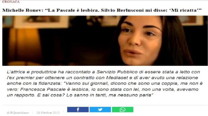 “Onore a Michelle Bonev (qui… https://www.ilfattoquotidiano.it/2013/10/18/berlusconi-michelle-bonev-pascale-e-lesbica-sanno-tutti/747811/amp/?fbclid=IwAR3BiAlstDP-hB0BsRAGmV1lO2tqA7Dgleg3RFvK4Em7BiolOo_B9Cak_9c… intervistata da Francesca Fagnani) che pagò carissimo l’aver detto la verità su Francesca Pascale già dieci anni fa”. Lo ha scritto in un Post pubblicato oggi 02 luglio 2022 sulla sua Pagina Facebook, Mario Adinolfi giornalista romano e fondatore de ‘Il Popolo della Famiglia’!