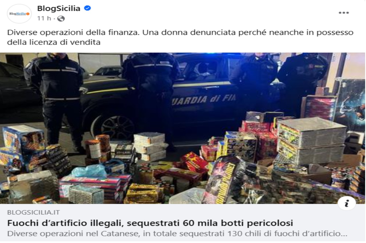Operazioni a tappeto a Catania della guardia di finanza contro i fuochi d’artificio illegali e quindi potenzialmente pericolosi: in diverse operazioni le fiamme gialle hanno sequestrato 60 mila botti per un totale di 130 chili, due le denunce. L’attività, partita su input del comando provinciale di Catania, intensificata in questi giorni per contrastare il sempre più diffuso commercio illegale dei fuochi d’artificio.